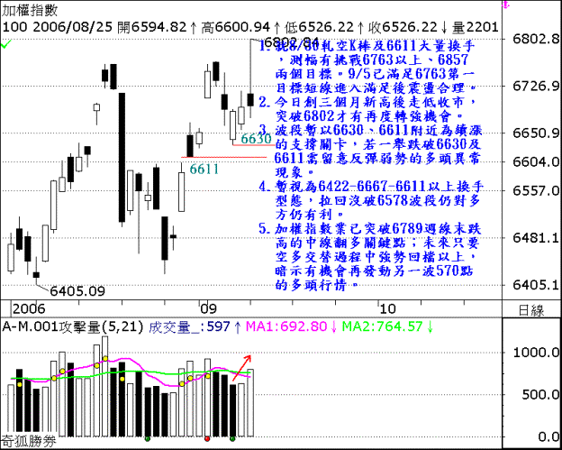 1.就8/30軋空K棒及6611大量換手,測幅有挑戰6763以上、6857兩個目標。9/5已滿足6763第一目標短線進入滿足後震盪合理。