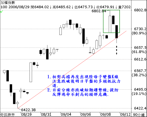 (1)波浪波動,為6630-6718.8-6689.9.4-6802這種走法。所以跌破9/8盤中轉折低點6689為弱勢,暗示短線修正啟動,應測試6655、6630附近兩個支撐點之一。(2)由今日分線下跌的過程表現,暗示先想辦法突破6712.5,便有機會超短線止跌挑戰6748空方壓力。未突破6712.5前殺多力道不止。
