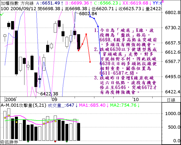 1.今日為「破底」K線,波段轉為「盤跌」格局,6698.4殺多高點未突破前,多頭沒有轉強的機會。