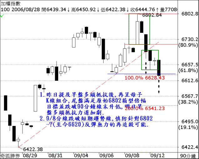 今日行情幾乎守在6630以上盤整,唯盤中波動越走越低,遲遲無法有效推動超短線多頭漣漪,種下最後跌破6630關卡的敗筆。由盤態分析,昨日為「穿頭」黑K棒線,波段視為6630以上的「盤堅」格局,今為「破底」黑K棒線,波段由「盤堅」轉為「盤跌」趨勢,若明日多頭抵抗弱勢,出現該彈不彈的走勢,則須提防未來回測跌破6611滿足6584以下的可能,而未來反彈只要無法突破6712高點,我們合理懷疑是針對6422-6802這段漲幅作修正走勢,倚靠8/30 K線止跌機率甚高。