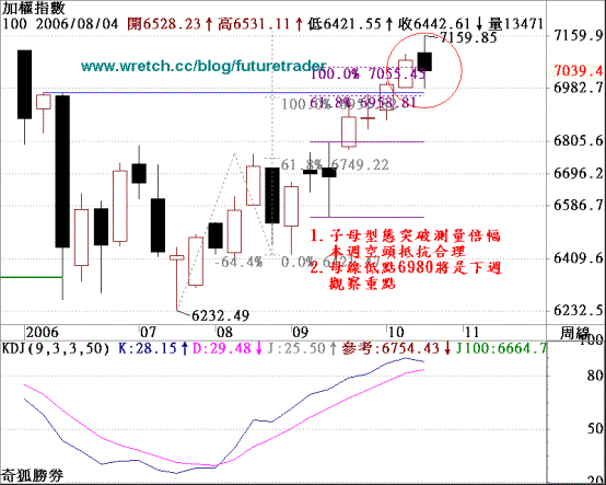 以周線K線型態觀察得知9/8、9/15兩週子母線倍幅7057已在上週突破滿足,且自7476回檔至6232的反彈已達相對強勢幅度,本週果如預期出現陰子母空頭抵抗現象,母線低點6080將是下週日線研判重要關鍵。由於上週已突破中期6/5這根殺多K棒6967.4,中期形成翻空為多的確認訊號。暗示未來即使拉回對分呈盤堅、甚至跌破6232都僅是盤跌(破即彈)的兩種型態,再度出現中期追殺格局的機會將隨之降低。