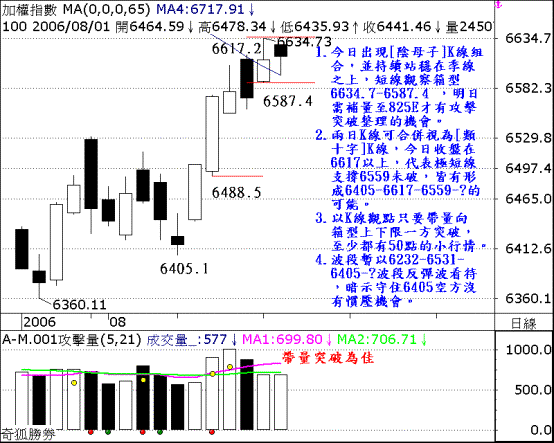 2.兩日K線可合併視為[類十字]K線,今日收盤在 6617 以上,代表極短線支撐6559未破,皆有形成 6405-6617-6559-? 的可能。
