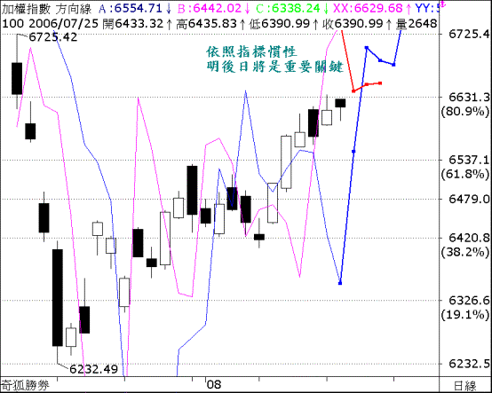 今日成交量持續量縮,在昨日高低點間上下震盪,在高檔壓力區量縮整理對多頭相對有利,且收盤在6617之上並站上季線,只要6559未破皆有發動多頭戰車機會,依照方向線指標慣性,明後日將是突破整理關鍵;行進間短線只要守穩6559就有機會來挑戰前波起跌點6725,6488未破中格局多頭波動持續,此波滿足點6705不變。