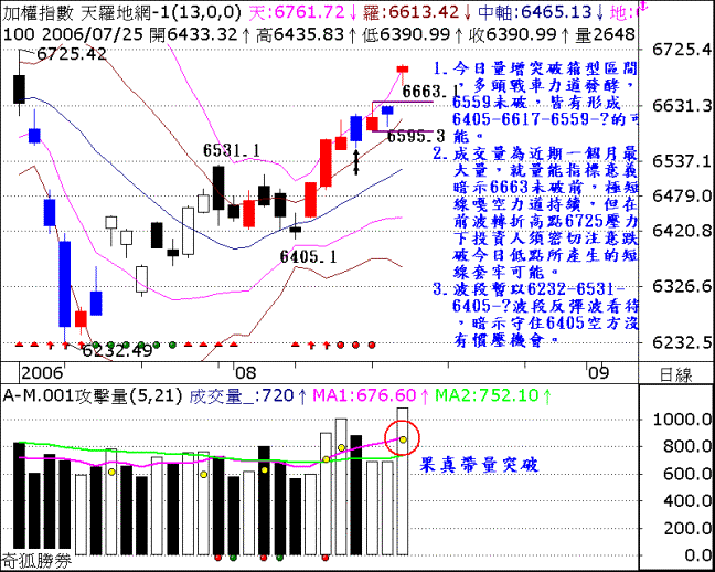 2.成交量為近期一個月最大量,就量能指標意義暗示6663未破前,極短線嘎空力道持續,但在前波轉折高點6725壓力下投資人須密切注意跌破今日低點所產生的短線套牢可能。