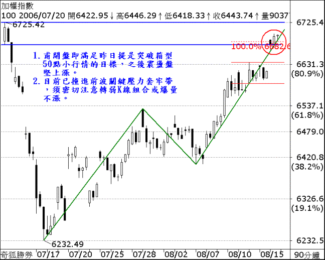 近期撞進 6634缺口以及7/12 [陰子母] K線組合的壓力區,震盪情形可預期,今日補量呈關鍵大量是否成短線出貨量能,觀察重點在於6663低點支撐。由於8/9突破6531,暗示多方防線將有兩個關鍵支撐:一是6405轉折低點,守住6405就波浪型態可望形成6232-6531-6405-至今6617這種模式,等浪在6704附近。其次,今日大量突破箱型低點6663也是多方防線的關鍵支撐,因此多方守住6663成為續攻的關鍵要件,出貨或是換手已即將面臨攤牌時刻。