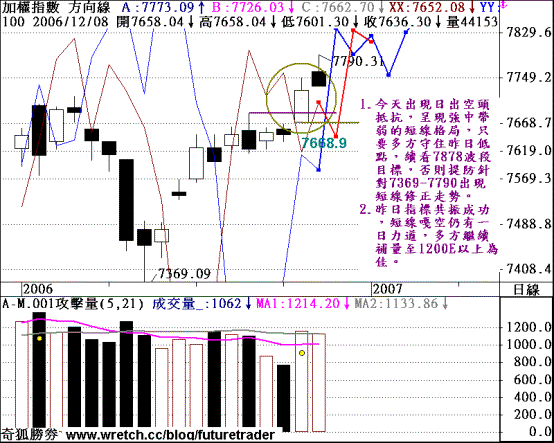 2. 昨日指標共振成功,短線嘎空仍有一日力道,多方宜守住7668.9且繼續補量上攻,否則疑有出現短線修正的可能。