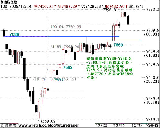 5.超短線觀察7790-7759.5-7769.8-#1的修正走勢,若明日無法迅速突破7749.5,提防行情有繼續下探7720,更弱者7695的可能。