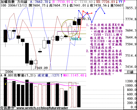 回顧昨日專欄K線型態敘述:『我們可以合理預期昨日創新高後的極短線多單賣壓和空頭抵抗出籠。今日K線收在最低點,反而對空頭相對有利,明日容易製造出日落K線』,今日雖高開越過轉強點7769,但回落走勢無法止穩再築出小底部,遂形成在7698以上的盤整震盪,但只要回檔走勢守穩7669,短期日線嘎空走勢不變,除非跌破7669,才需思考是否有機會針對7369-7790整段做出修正走勢。