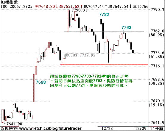 4. 超短線觀察7790-7733-7782-#1的修正走勢,若明日無法迅速突破7763,提防行情有再回測今日低點7721,更弱者7698的可能。