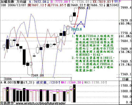 (2)短期指標業已進入空方防線。昨多方勝出,並滿足7908,如能守住7720.2便有機會將上檔推向測試目標8063、8142。