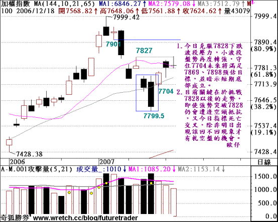 (2) 目前關鍵在於挑戰7828以後的走勢,即使強勢突破7828仍會遭逢空頭抵抗,又今日指標死亡交叉,除非明日出現該回不回現象才有軋空盤的機會。否則若如假設來到7828-7869這裡應遭逢較大的賣壓。