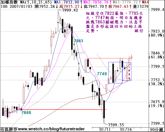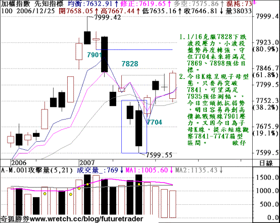 (1)1/16克服7828下跌波段壓力,小波段盤勢再度轉強,守住7704未來將滿足7869、7898預估目標,並暗示短期底部成立。今日K線呈現子母型態,只要再突破7841,可望滿足7935預估測幅。