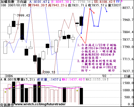 (1) 今日滿足1/23母子測幅目標7957以上,甚至未來針對K線形態可望續攻8030-8050的多頭超強區間。