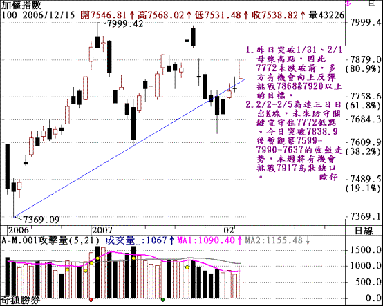 連接06年12/13低點7369至1/11低點7599.5的上升趨勢線,在1/30跌破支撐後,先前皆無法成功站上壓力線,波段力道轉弱。就K線而言,未突破7838.9這裡的壓力,對空方有利,預估落底有兩種技術型態:一是等待量縮沈澱至多方止跌量615E。今日站上假設的上升趨勢線,若能守住今低7802,波段多方力道就能再轉強,